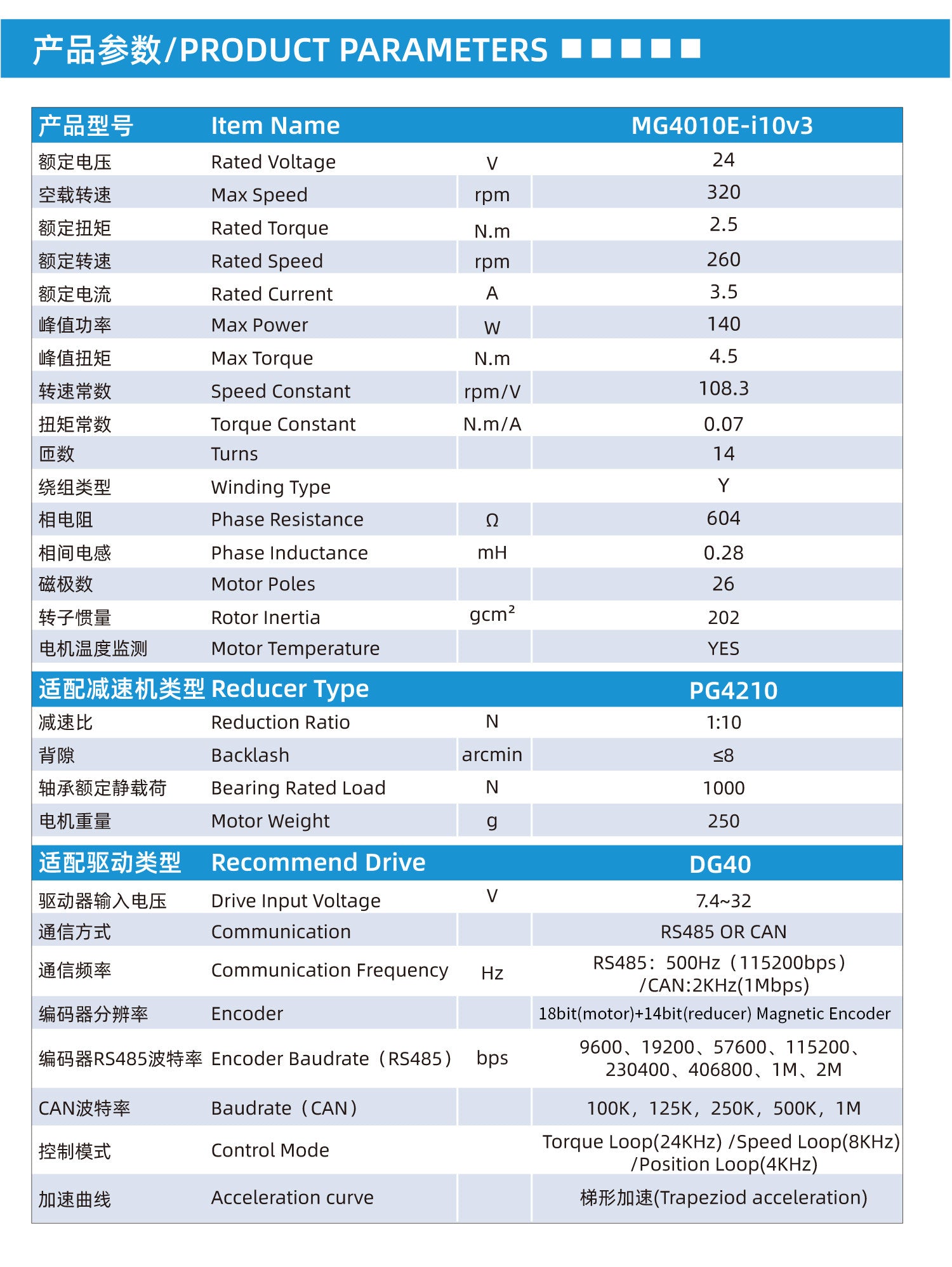 The MG4010E i10 V3 is a compact integrated servo actuator designed for robotics and automation applications. It integrates motor reducer dual encoder system and drive electronics into one unit, simplifying system integration and reducing wiring complexity.